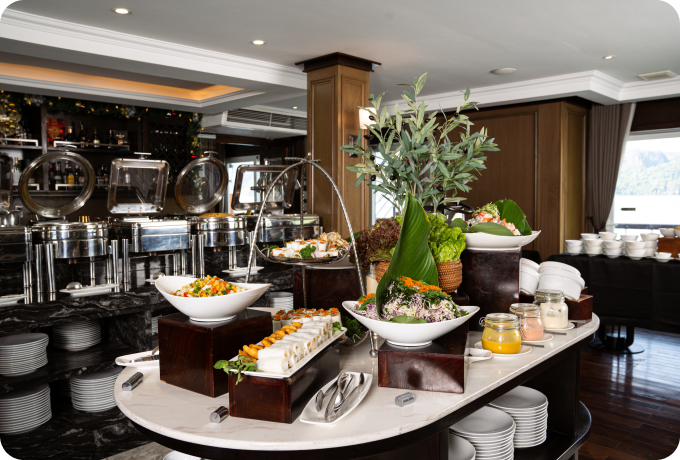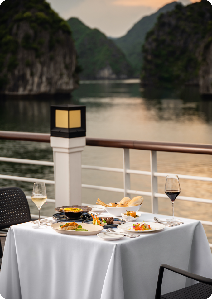 Savor a delicious lunch whilst enjoying the majestic views of Lan Ha Bay's islands and islets.